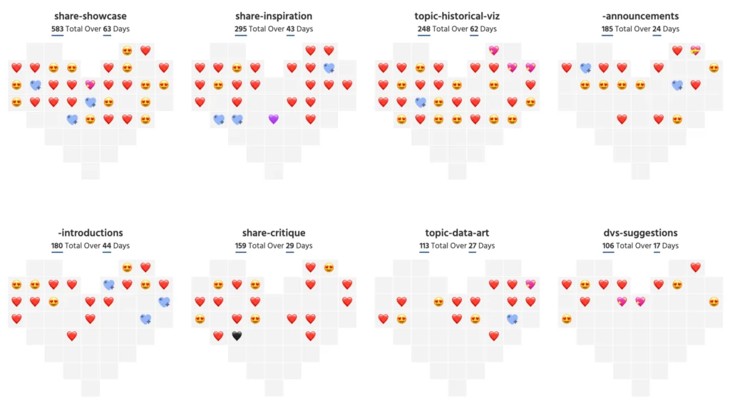 This small multiples visualization shows the usage of “heart” emojis in the various DVS Slack channels over time by highlighting the most frequently used emoji per day.