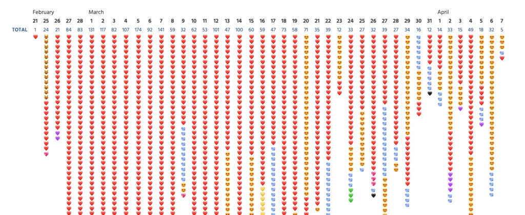 But the sheer number of heart emojis used made the timeline difficult to read, so I created a second interactive that grouped the data by channel. To keep with the “heart” theme, I decided to lay out the timeline in a heart shape using CSS Grid. The most frequently used emoji for each day is visible, offering a more nuanced view of each channel’s heart emoji usage. A tooltip was added to provide more detailed information for each day in a channel.