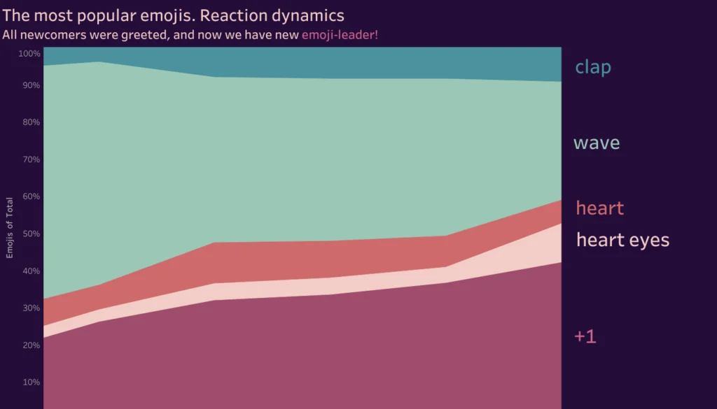 Visualizations about channels in dynamic – how much post was there, how much emojis. The bright one – for fun, and two with little research.
