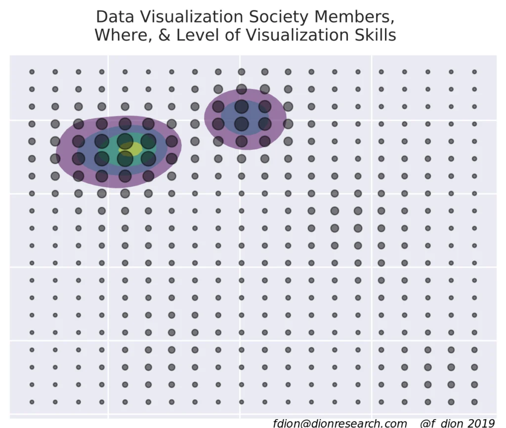 Regional level of individuals with visualization skills as a two dimensional isometric density estimation, along with a density dot map. Using long and lat as x and y creates an approximation of a map, without using a base map.