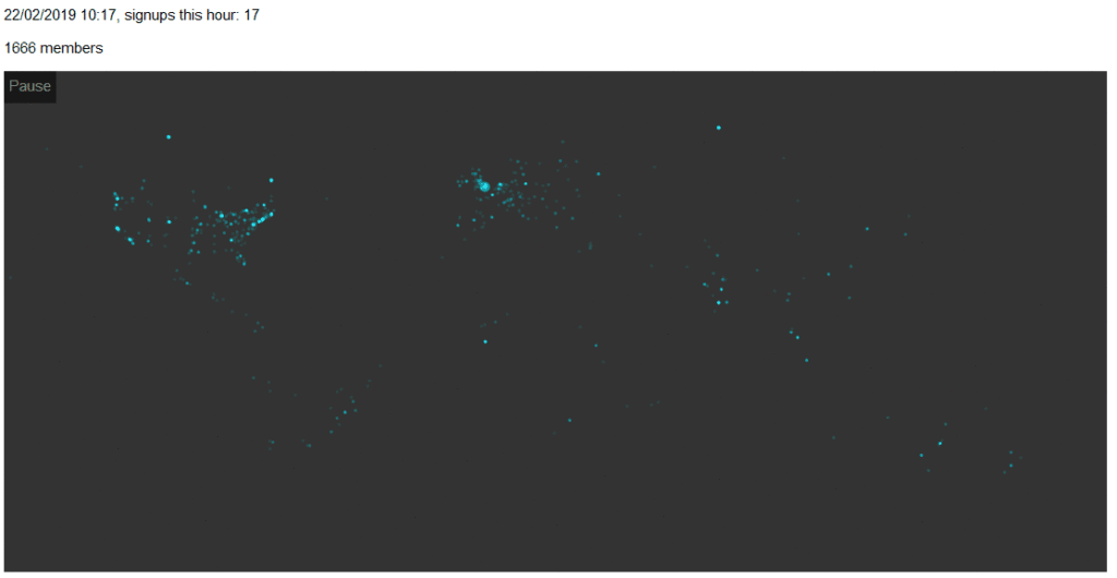 Animated map of sign ups over time. Each time a dot lands on the map a note is played. The notes vary in pitch according to the longitude of the sign up. Time speeds up and slows down to keep the rate of sign ups relatively constant.