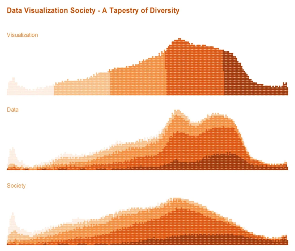 This is, imo, a refined version of the original post, with the same message, DVS is heterogeneous. If the original salt-and-pepper approach suggested quite well the heterogeneity, this version provides as bonus a visual aggregation of visual skills (pivotal criteria of DVS) across the other criteria distributions. I guess an animation that would move the dots from the visual distribution to data distribution pile and then to society pile would work great.