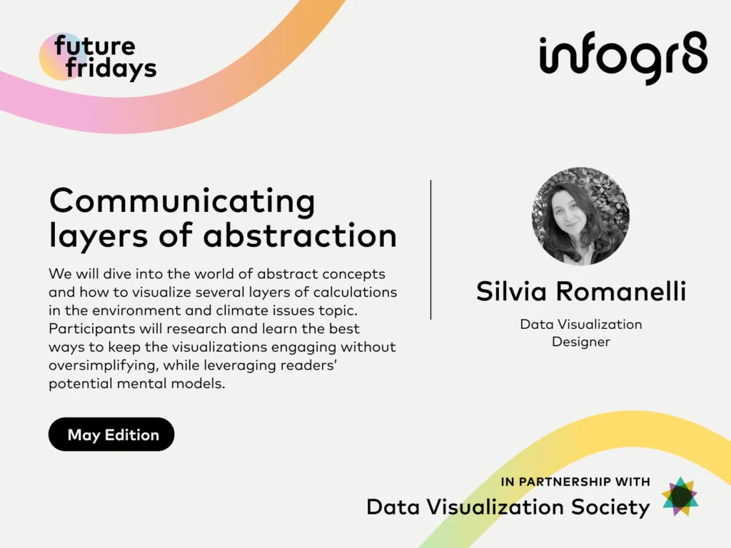 Silvia Romanelli, May’s luminary, will dive into the world of abstract concepts and how to visualize several layers of calculations in the environment and climate issues topic. Participants will research and learn the best ways to keep the visualizations engaging without oversimplifying, while leveraging readers’ potential mental models.